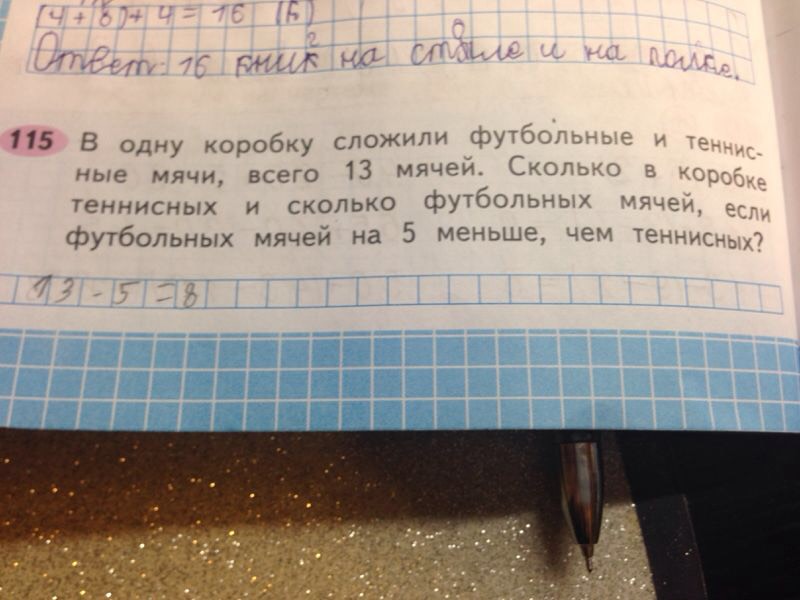 1)13-5=8 футб.мячей., 2)13-8=5 мячей тен.