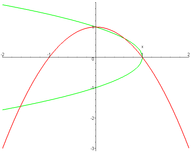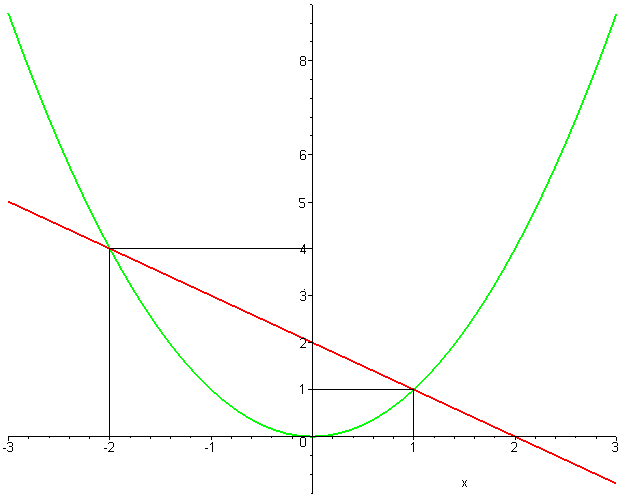 График первой функции - парабола ветвями вверх с вершиной в начале координат. График второй - прямая. Точки пересечения график - решения системы (рис. 1) Это точки (-2; 4) и (1; 1)