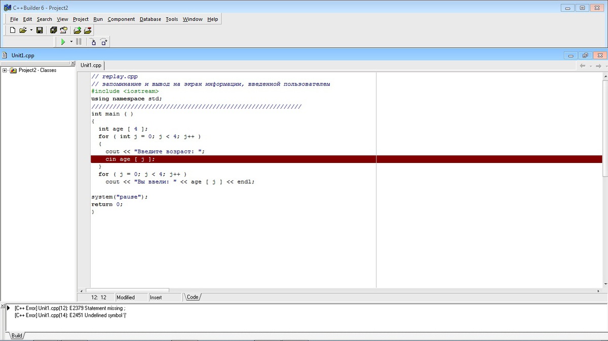 У Вас во втором цикле переменная j не объявлена (заменить на int j) и в выделенной красной строке нет оператора, за cin таскающегося: