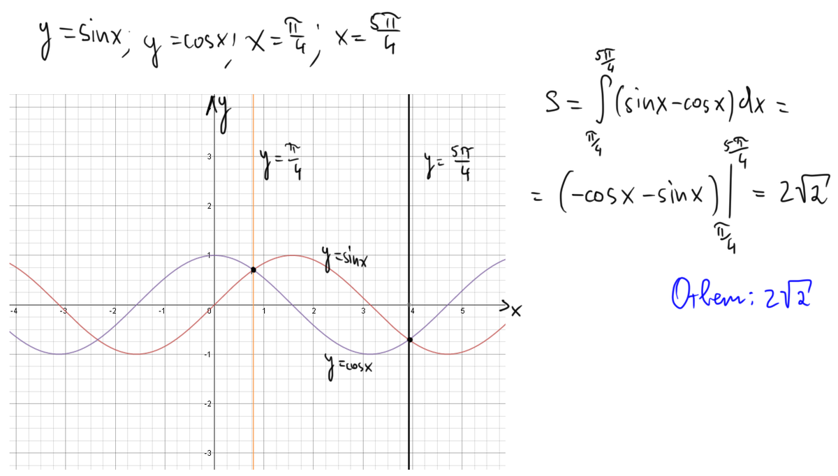 3. y=sinx, y=cosx, x=pi/4 и x=5pi/4