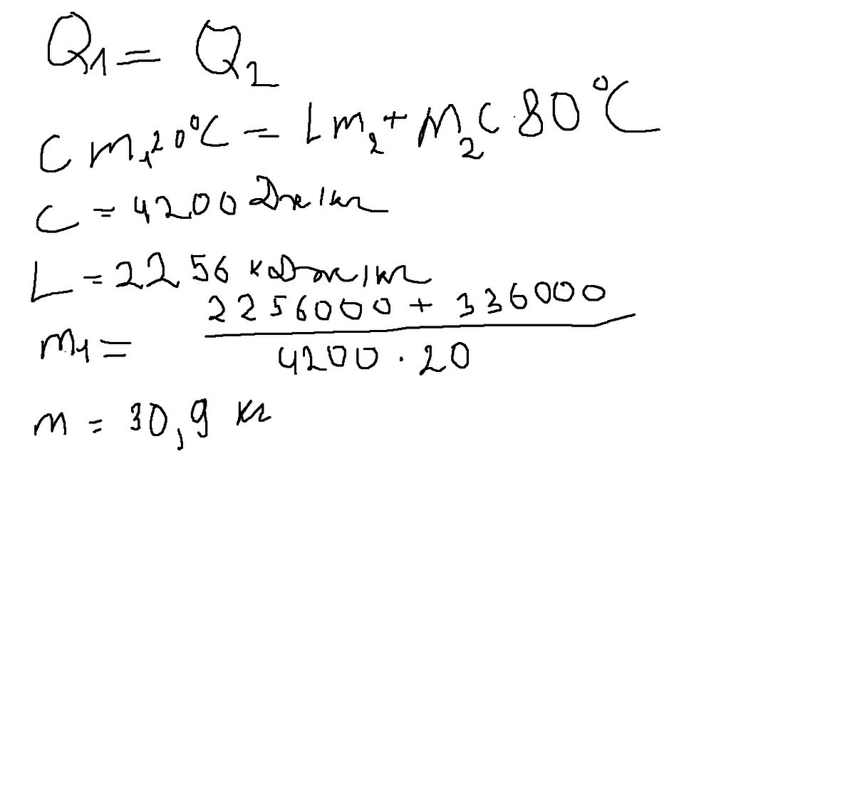 1 В сосуд с водой взятой при температуре 0 градусов, впустили 100 градусный пар массой 1 кг. Спустя некоторое время в сосуде установилась температура 20 градусов. сколько воды было в сосуде,Теплообмен с окружающей средой не происходит.