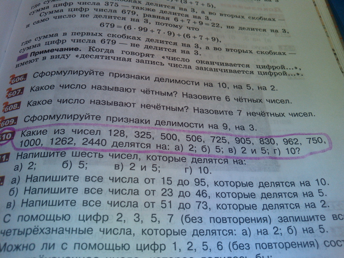 Задание: Какие из чисел 128 325 500 506 725 905 830 962 750 1000 1262 2440 делятся на: