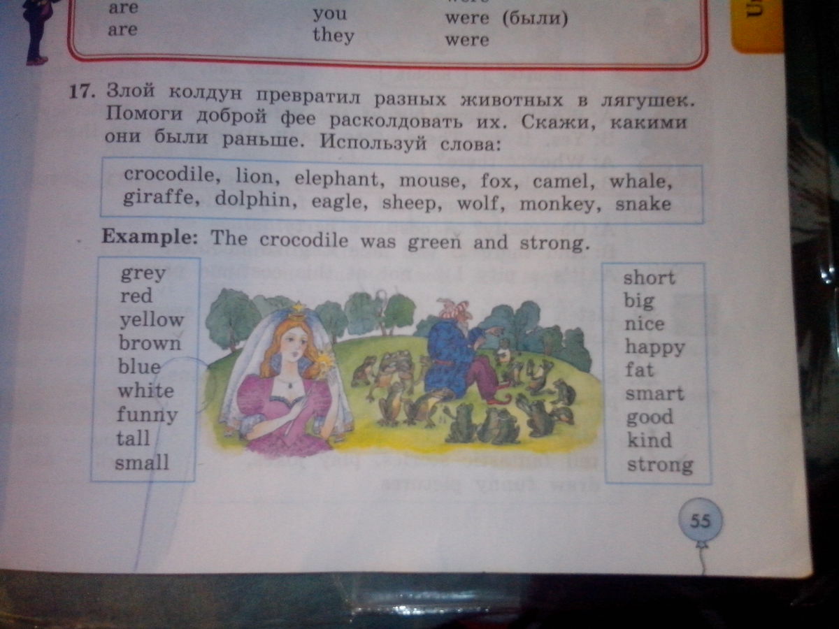 Ты должен сделать так The lion was yellow and big там внизу по англиском написано так The crocodile was green and strong ти должна заменить crocodile как на верху типа mouse, fox,camel и т.д слово green заменяешь которые слева типа yellow, brown,funny, blue ,red ,brown , white и т.д слово strong меняешь которые справа тип big, nice,short,kind и т.д.Это всё если понравилось поставь спасибо! (И у меня такой же учебник:D)