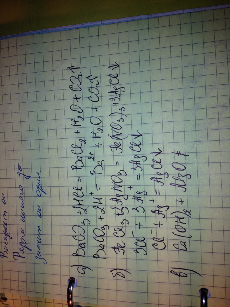 Напишите молекулярное, полное и сокращенное ионные уравнения реакций между растворами следующий веществ: а) карбонат бария и соляная кислота Б)хлорид железа(3) и нитрат серебра в) гидрооксид кальция и оксид магния