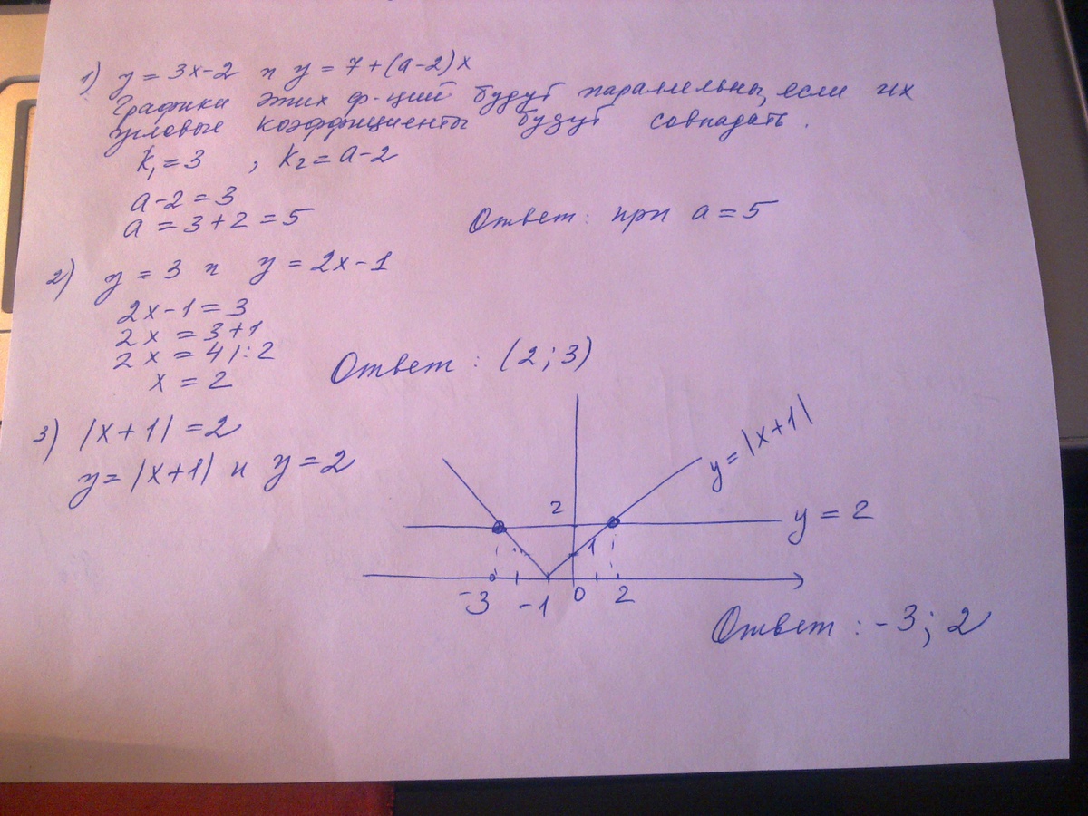 1.при каком значении параметра а графики функций у=3х-2 и у=7+(а-2)х параллельны?