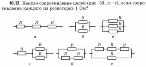 В первых они последовательно идут,следует 1+1+1.Второй по разным ветвям,сопротивление общее,тобишь один которое дано,делится пополам.Третье,теперь их 3,видишь,они по разным идут,теперь мы общее делим на три.Четвёртый сначало один по основнйо ветви,тобишь 1+ а вторая ветвь нам встречалась,она уже известна что 0,5,прибавляем 1+0,5=1.5.Пятый вверху 1 Ом,внизу 1+1 Ом,но они на разных ветвях,значит всего з Ом,но так как на разных ветвях а их 2,делим на два,получаем 1.5 Ом.Шестой 1+1+1 и внизу 1,