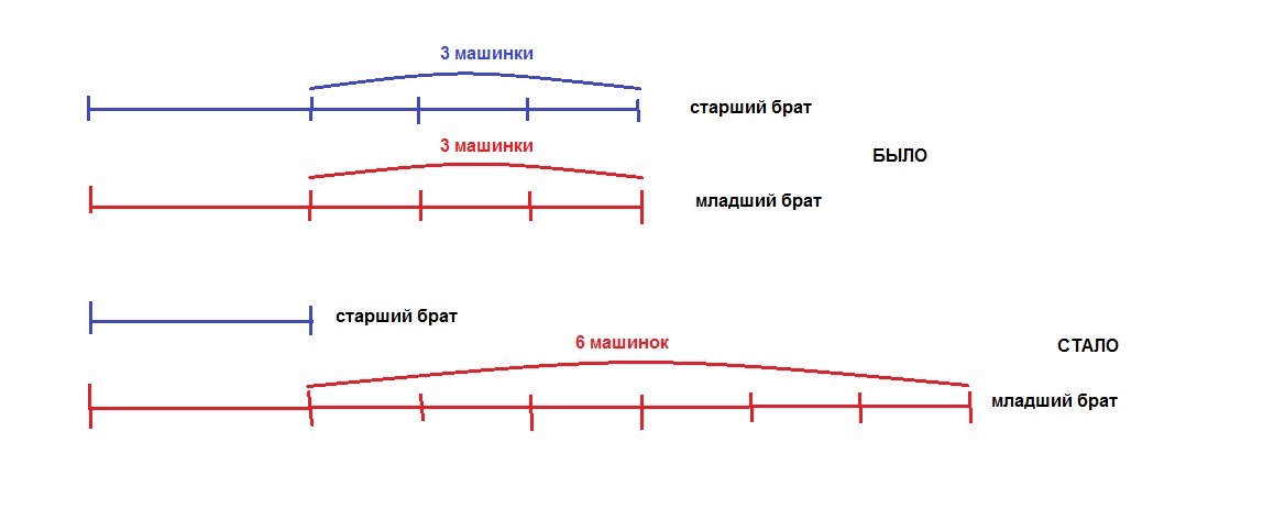 Допустим у млачшего брата 6 машинок, то и у старшего 6 машинок.
