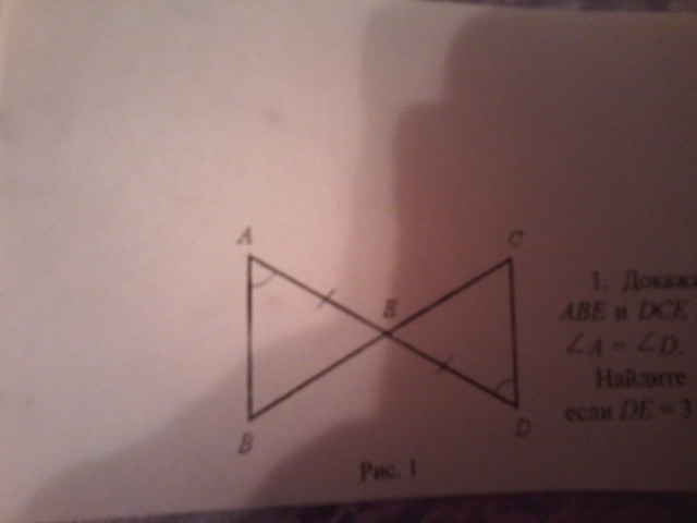 помогите плиз...1.докажите равенство треугольников ABE и DCE на рисунке 1,если AE=ED,угол A=углуD.Найдите стороны треугольника ABE,если DE=3см,DC=4см,EC=5см