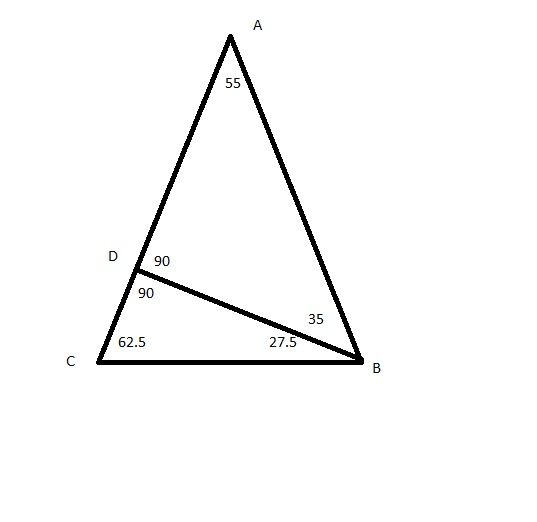 АВС - равнобедренный треугольник. ВС - основание. Угол А = 55 градусов.ВD - высота треугольника. Чему равен треугольник DВС?