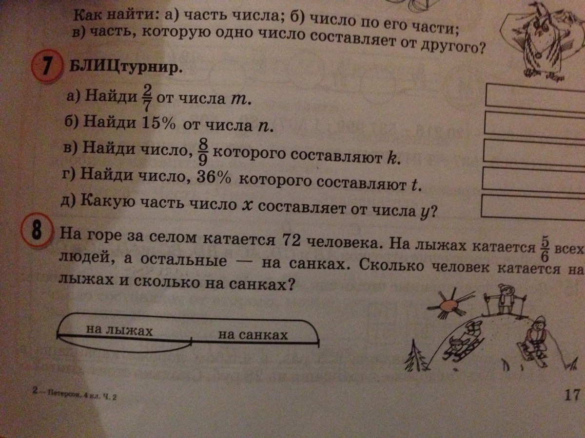 Одна шестая 72 будет 12, пять шестых катаются на лыжах. Получается, что на санках катается одна шестая, то есть - 12 человек. А остальные, то есть, 60 человек - на лыжах!