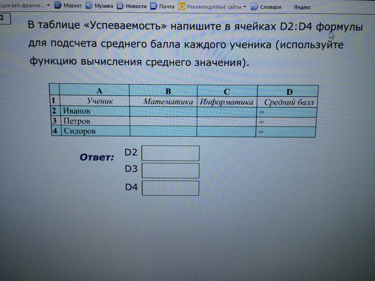 В ячейки D2 - D4 необходимо вставит формулу СРЗНАЧА(B2:C2) Решение в файле
