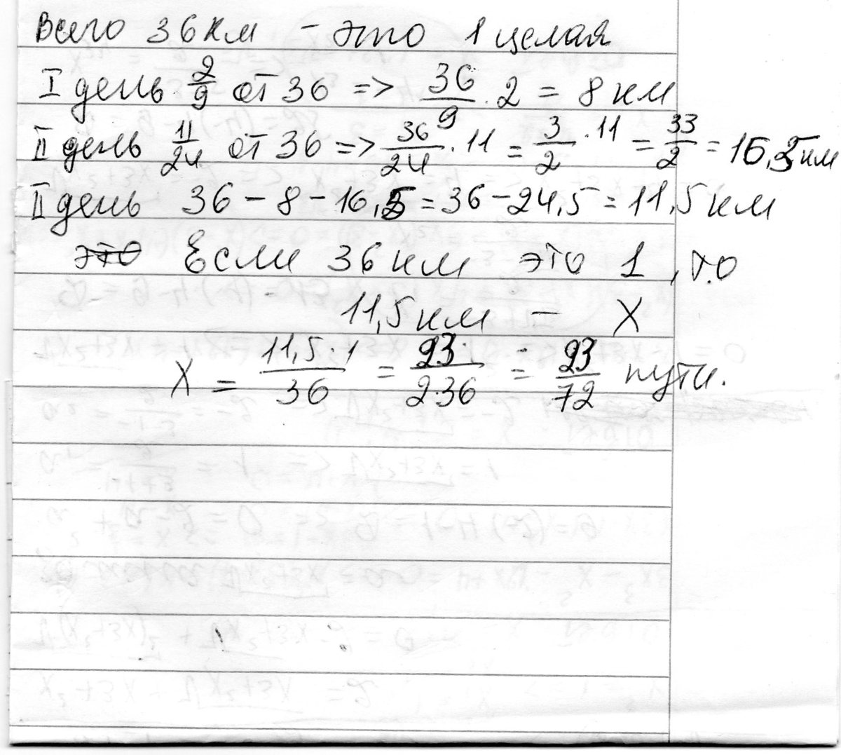 Запланированный на три дня путь туристического отряда-36 км.В первый день пройдено 29 всего пути , а во второй -1124 всего пути а) Какой путь пройден в каждый из трех дней ? б) Какая часть пути пройдена в третий день ?