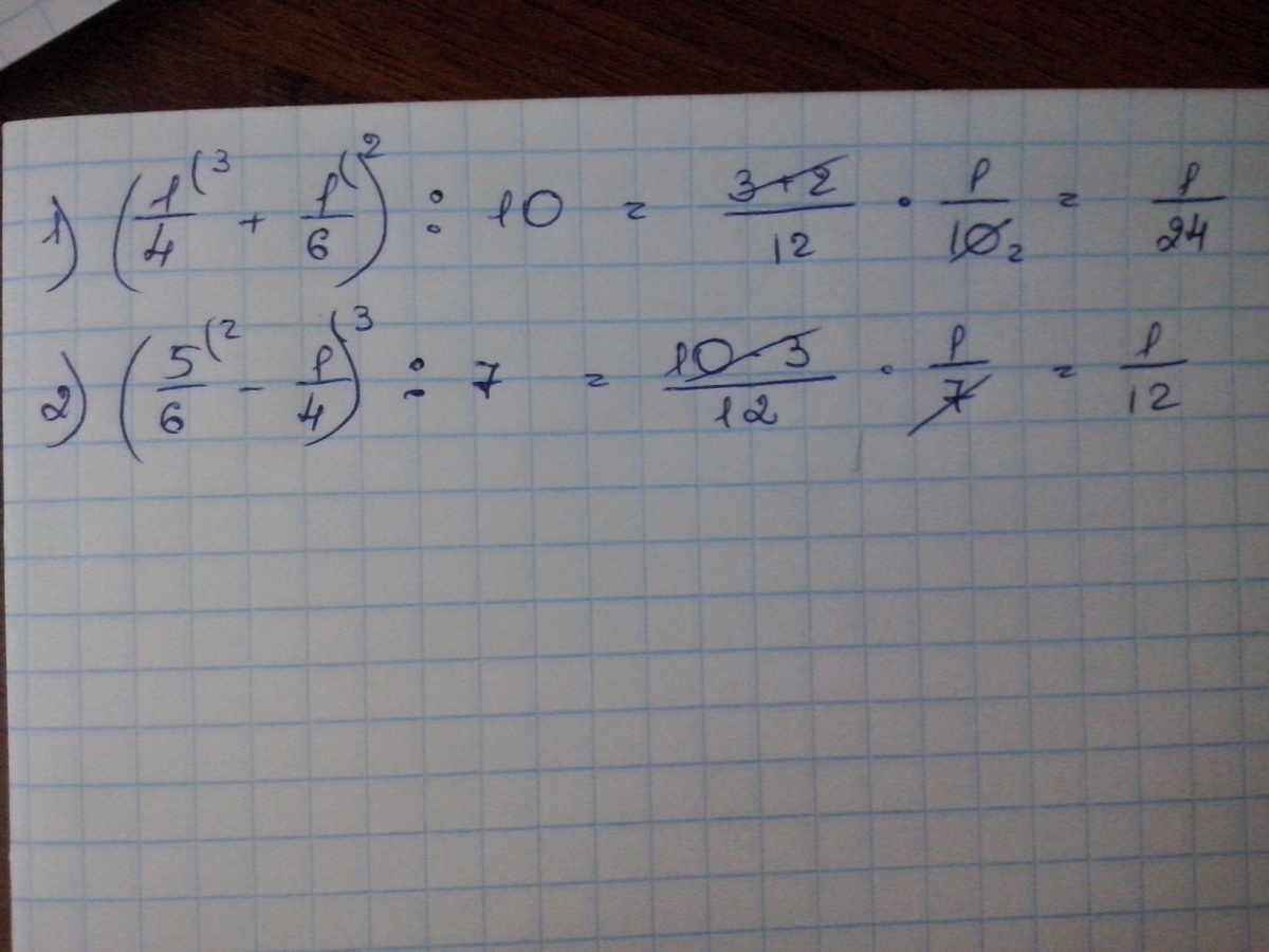 приводим к общему слагаемому первую скобку и подсчитываем, после чего делим на число, делить это тоже самое что умножить на обратное ему число, то есть 10 превращается в 1/10. И потом сокращаем