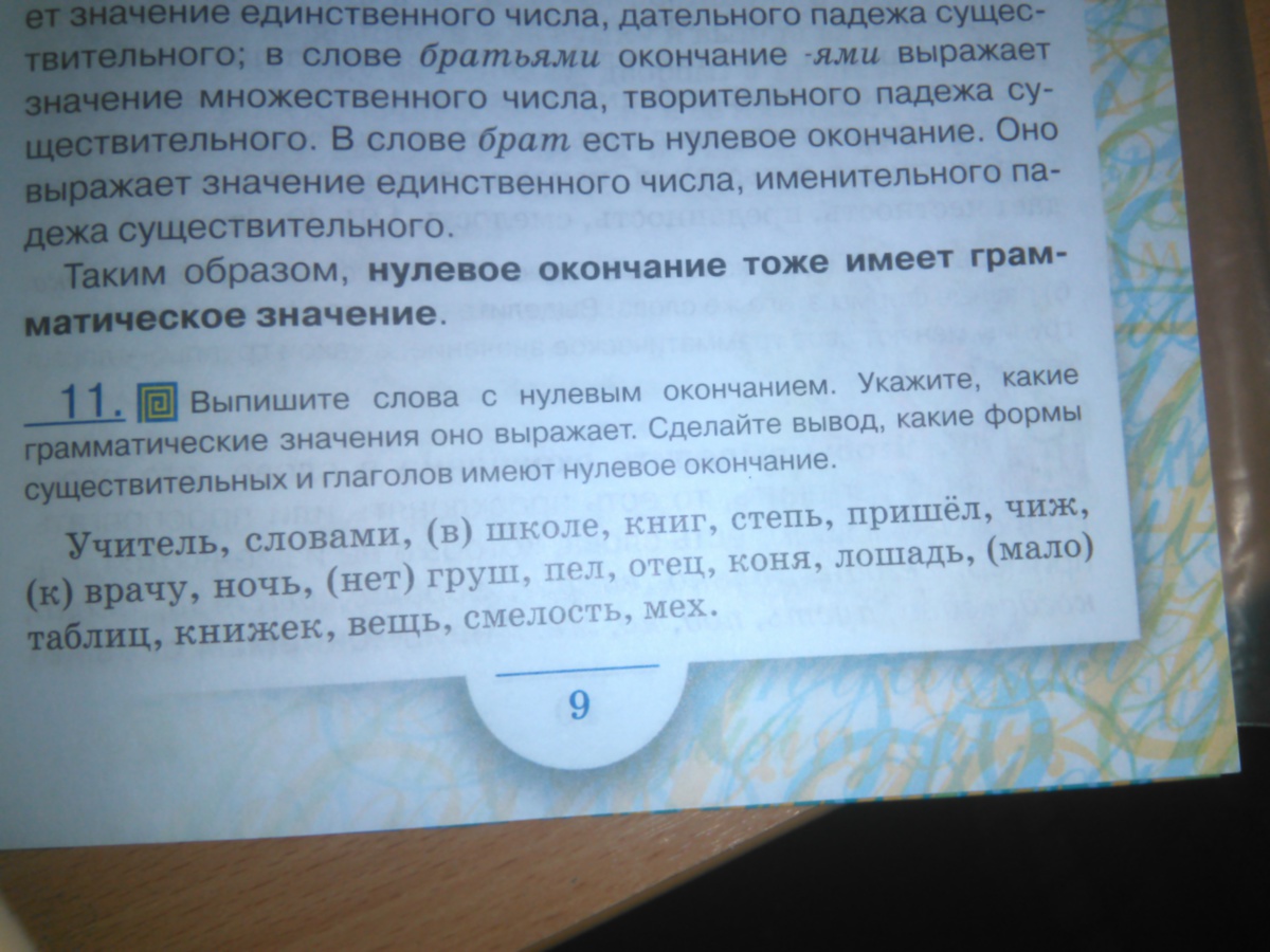 Слова с нулевым окончанием: учитель, книг, степь, пришёл, чиж, ночь, (нет) груш, пел, отец, лошадь, (мало) таблиц, вещь, смелость, мех
