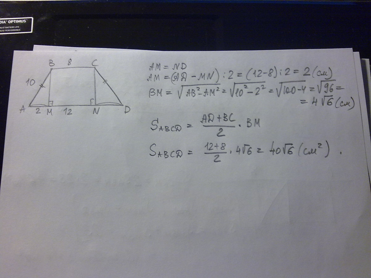 Найдите площадь равнобедренной трапеции,