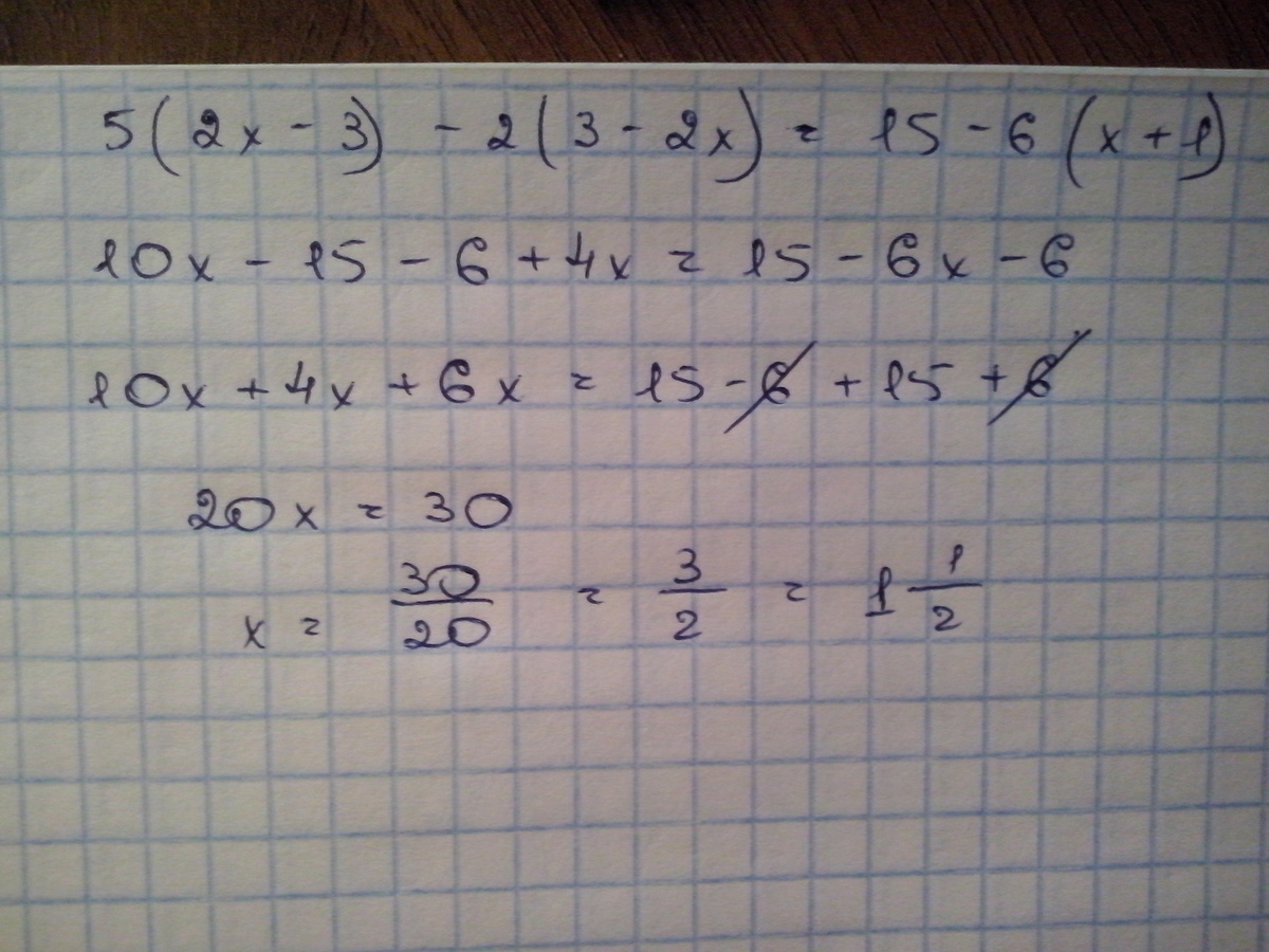 5(2x-3)-2(3-2x)=15-6(x+1)