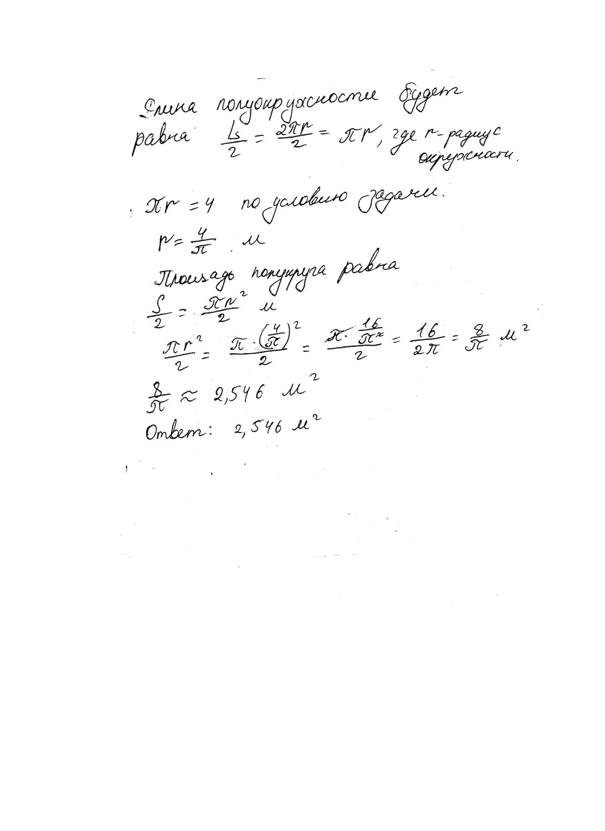 Чему равна площадь полукруга, длина полуокружности которого равна 4 метра? (Число Пи округлить до целых)
