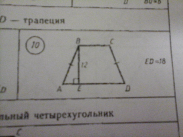 Дана равнобедренная трапеция ABCD c основаниями BC и AD, проведена высота ВЕ=12см, а ЕD=18 см. Найти площадь трапеции