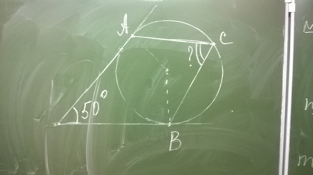 Пусть О - центр окружности, D - точка из которой проведены касательные. Радиусы перпендикулярны в точках касания A и B к касательным, то есть углы там равны по 90 градусов. Сумма углов в выпуклом четырехугольнике DAOB равна 360 градусов. Центральный угол AOB равен 360-90-90-50=130 градусов. Вписанный угол равен половине центрального угла, значит искомый угол равен 130/2=65 градусов.