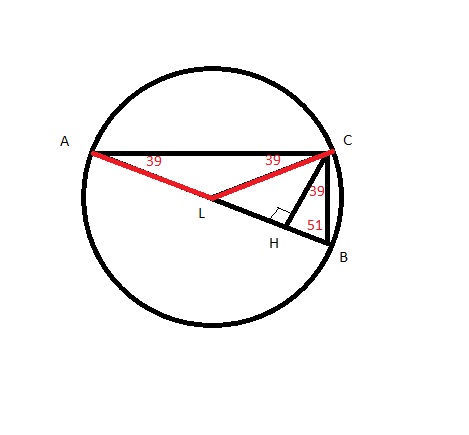 Прямой угол опирается на диаметр, значит проведенная медиана будет равна радиусу описанной окружности и равна половине гипотенузы. Значит треугольник АЛС - равнобедренный и в нем углы А и С = 39 градусов.