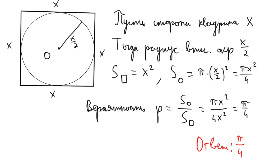 Найти вероятность того, что точка, брошенная в квадрат, окажется внутри вписанного в него круга, если все положения точек в квадрате равновозможны.