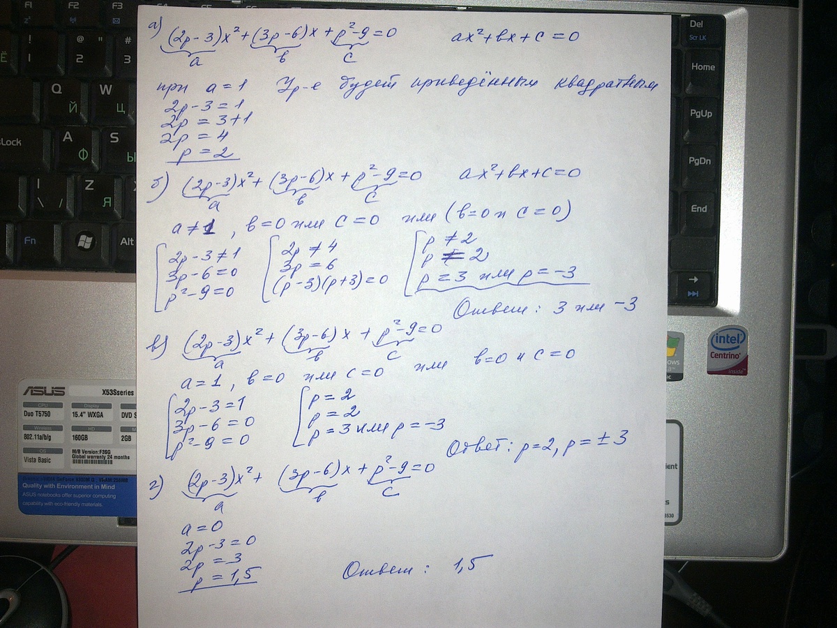 При каких значениях параметра p уравнение (2p-3)x^2+(3p-6)x +p^2-9=0 является: