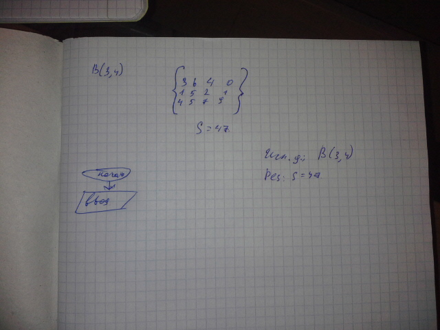 помогите решить задачу по информатики, вот условие и фото с введенными значениями ,, Дан массив целых чисел (3,4) найти сумму всех элементов массива,, нужно написать программу дописать алгоритм