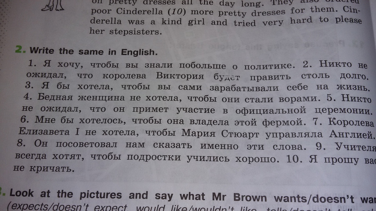 long. 3) I'd like you to earn a living yourself. 4) A poor woman didn't want them to become thieves. 5) No one expected him to take part in the official ceremony. 6) I'd like her to own this farm. 7) the Queen Elizabeth didn't want Maria Stuart to rule England. 8) He advised us to say these exact words. 9) teachers always want teenagers to study well. 10) I'm asking you not to shout.