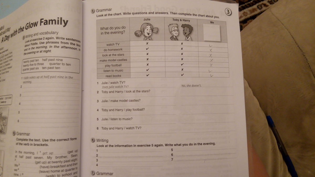 Do Toby and Harry look at the stars? Does Julie make model castles? Do Toby and Harry play football? Does Julie listen to music? Do Toby and Harry watch TV?