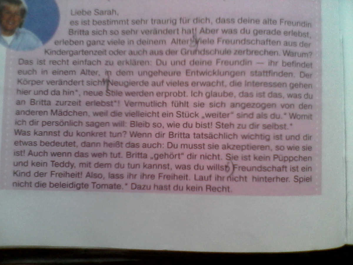 это действительно очень печально для тебя, что твоя старая подруга Брита очень так изменилась. Но то что ты сейчас переживаешь, переживают все в твоем возрасте.Многие дружеские отношения, сложившиеся в детском саду или в начальной школе, распадаются. Почему? Это очень просто объяснить: Ты и твоя подруга - вы находитесь в таком возрасте, в котором происходят большие развития. Тело меняется. Просыпается любопытство ко многому, интересы меняются, пробуются новые стили поведения. Я полагаю, что это то, что с Бритой в настоящее время происходит. Вероятно, ее притягиваю другие девочки, так как они, возможно, опытнее тебя. Что я тебе лично хочу сказать: Оставайся такой, какая ты есть! Будь себе верна!