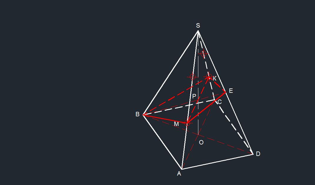В правильной четырехугольной пирамиде SABCD точка S- вершина ,AB=8, SC=6.Точка M принадлежит ребру SA,точка K-ребру SC, причём AM/MS=CK/KS=1/2.Найдите угол между плоскостями BMK и ABC. ПОМОГИТЕ!