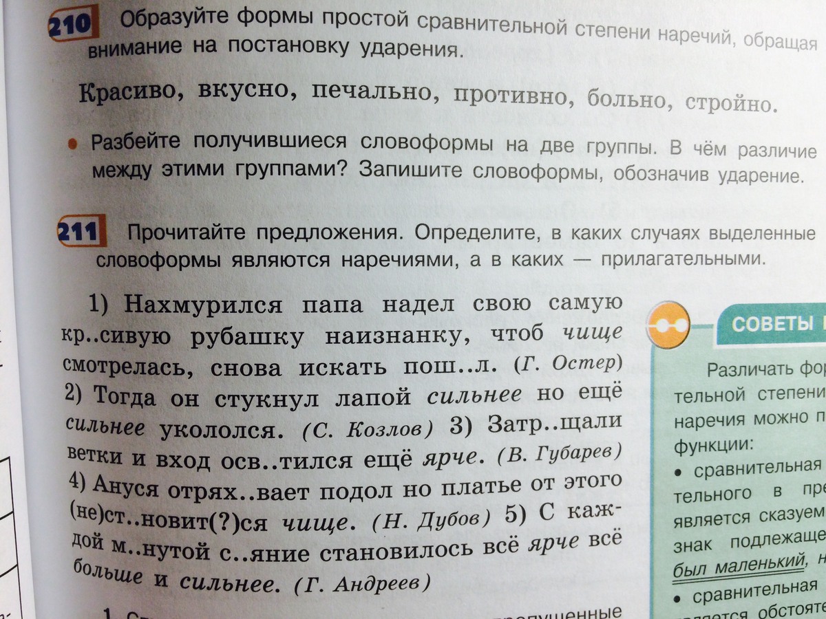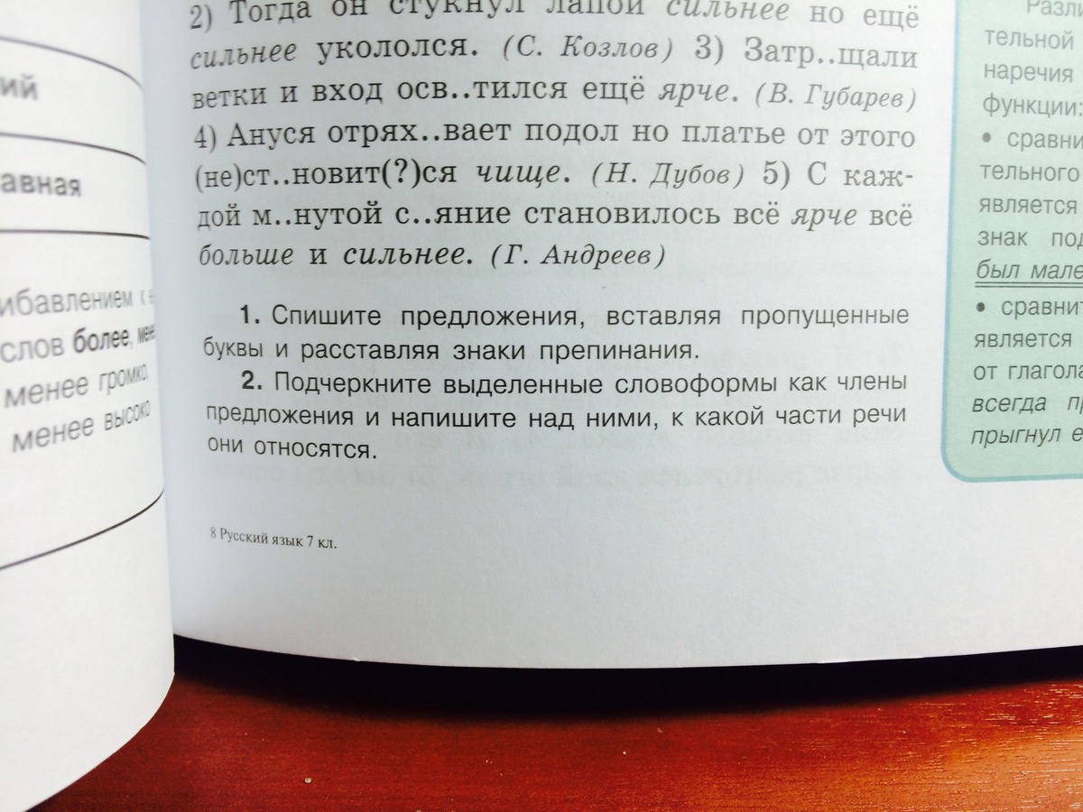 Нахмурился папа, надел свою самую красивую рубашку наизнанку, чтоб ЧИЩЕ (смотрелась КАК? - наречие, подчеркнуть _._._) смотрелась, снова искать пошёл .Тогда он стукнул лапой СИЛЬНЕЕ (стукнул КАК? - наречие, подчеркнуть _._._), но еще СИЛЬНЕЕ (укололся КАК? - наречие, подчеркнуть _._._) укололся. Затрещали ветки, и вход осветился еще ярче (осветился КАК? - наречие, подчеркнуть _._._). Ануся отряхивает подол, но платье от этого не становится ЧИЩЕ (становится КАКИМ? - краткое прилагательное, подчеркнуть =, входит в составное сказуемое). С каждой минутой сияние становилось все ярче (становилось КАКИМ? краткое прилагательное, подчеркнуть =, входит в составное сказуемое), все больше (становилось КАКИМ? краткое прилагательное, подчеркнуть =, входит в составное сказуемое) и сильнее (становилось КАКИМ? краткое прилагательное, подчеркнуть =, входит в составное сказуемое).