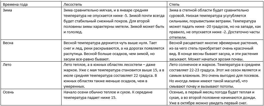 Охарактеризуй времена года в зонах лесостепи и степи.