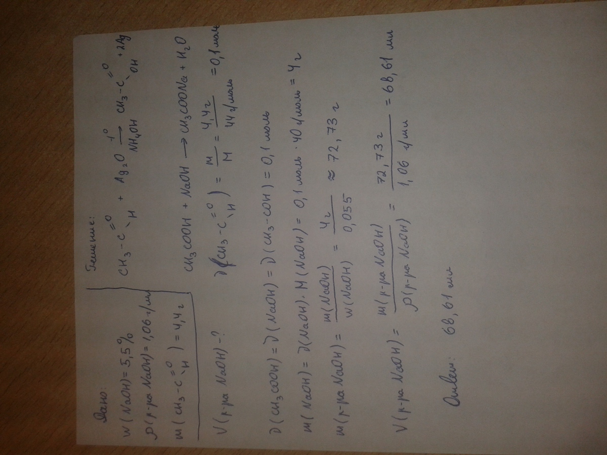 Какой объём раствора гидроксида натрия с массовой долей гидроксида натрия 5,5 %(плотность 1,06 г/мл) потребуется для нейтрализации кислоты, полученной окислением 4,4 г этаналя
