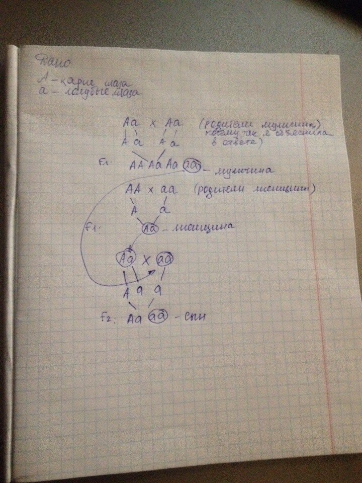 Голубоглазый мужчина, оба родителя которого имели карие глаза, женился на кареглазой женщине, у отца которой карие глаза, а у матери – голубые. От этого брака родился один голубоглазый сын. Определите генотипы каждого из упомянутых лиц.