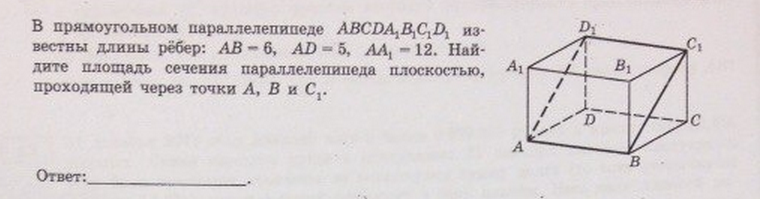 В прямоугольном параллелепипеде ABCDA1B1C1D1 известны длины ребер: AB=6, AD=5, AA1=12. Найдите площадь сечения параллелепипеда плоскостью, проходящей через точки A, B и C1
