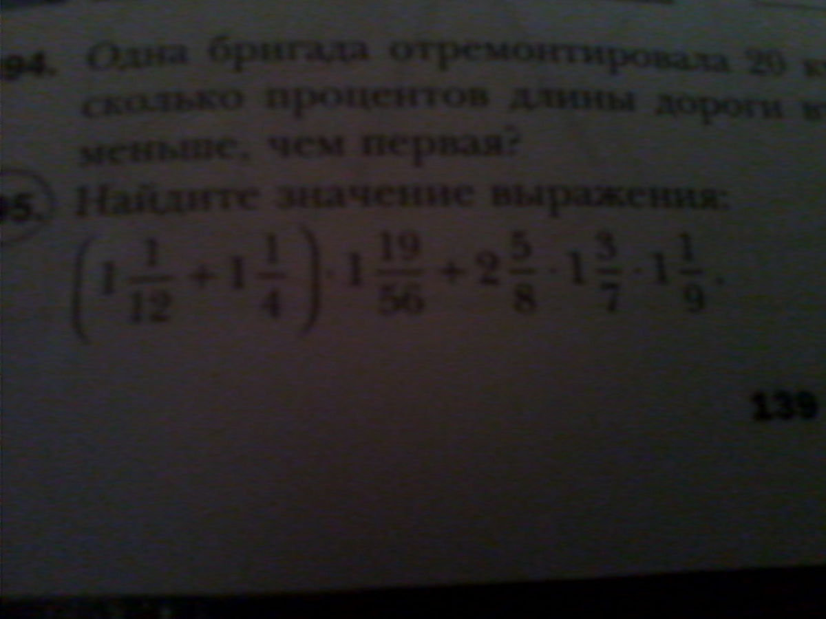 (1frac{1}{12}+1frac{1}{4})*1frac{19}{56}+2frac{5}{8}*1frac{3}{7}*1frac{1}{9} =(frac{13}{12}+frac{5}{4})* frac{75}{56}+frac{21}{8}*frac{10}{7}*frac{10}{9}= (frac{13}{12}+frac{5*3}{4*3})* frac{75}{56}+frac{7*3}{2*4}*frac{2*5}{7}*frac{2*5}{3*3}=frac{13+15}{12}*frac{75}{56}+frac{25}{6}=frac{28}{12}*frac{75}{56}+frac{25}{6}= frac{2*14}{3*4}*frac{75}{4*14}+frac{25}{6} =frac{25}{8}+frac{25}{6}= frac{25*3+25*4}{24} = frac{75+100}{24}= frac{175}{24}=7 frac{7}{24}