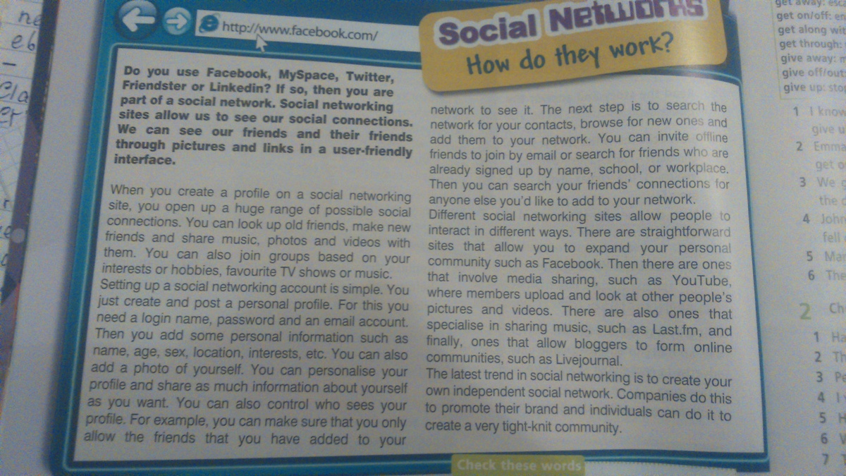 Используете ли вы Facebook, MySpace, Twitter, Friendster или Linkedin? Если да, тогда вы принадлежите социальной сети. Социальные сети позволяют нам поддерживать связи. Мы можем видеть наших друзей и из друзей по картинкам и ссылкам в списке друзей.