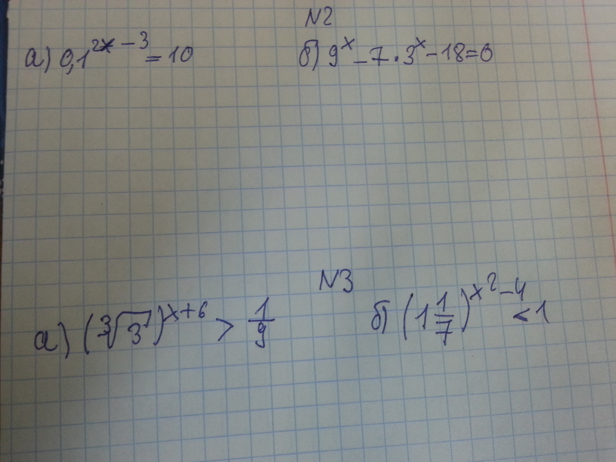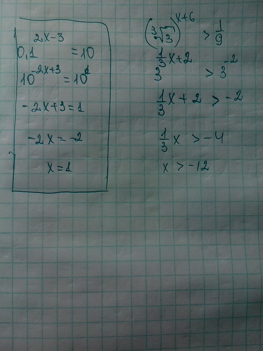 первое (10^-1)^2х-3=10 основания одинаковые их убираем