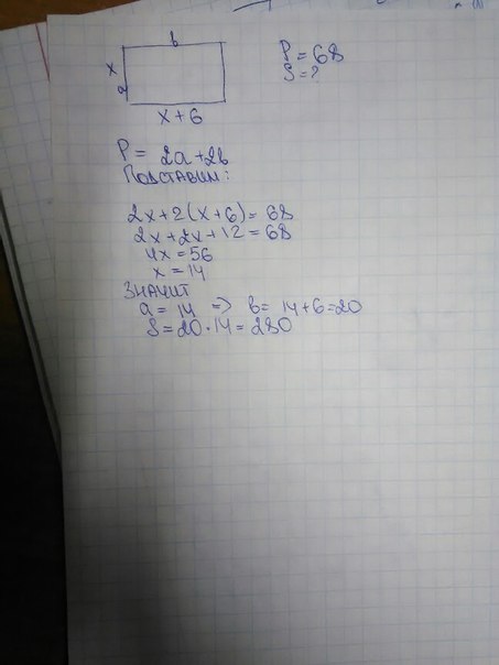 Пусть одна сторона прямоугольника х см, тогда вторая х+6. Полупериметр его будет х+х+6, что составляет 34 см. Составим и решим уравнение.