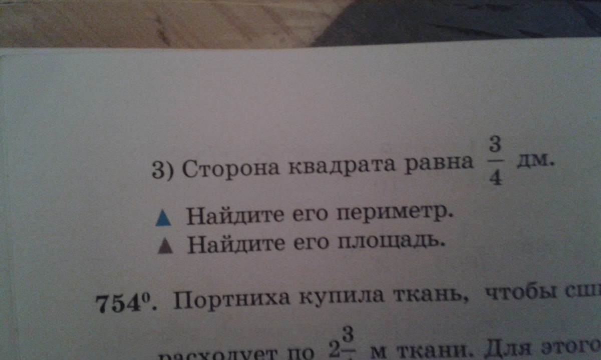 S = 3/4 *3/4 = 9/16 (дм^2)