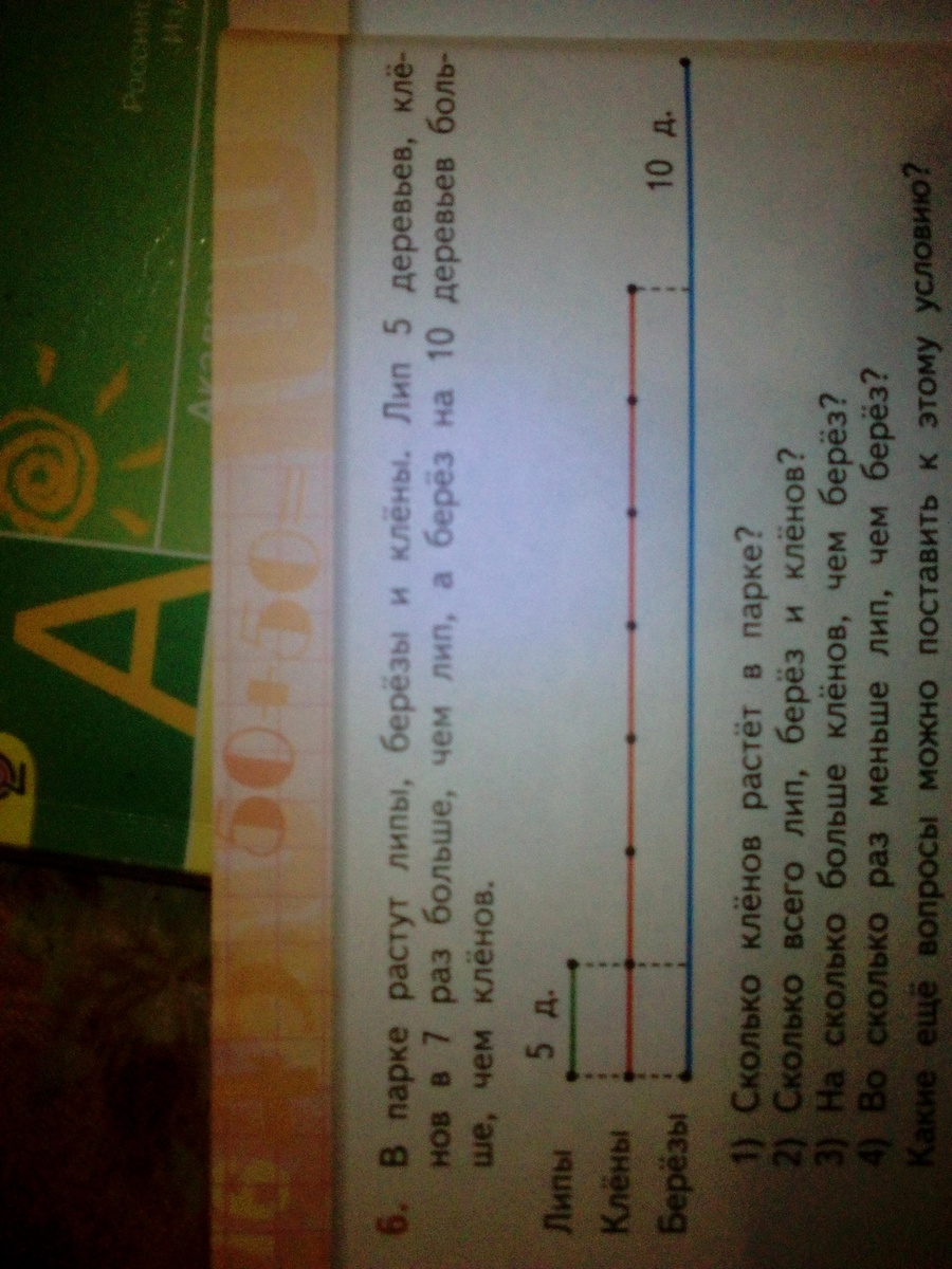 5*7=35 кленов 35+10=45берез 1)35 кленов 2)5+35+10=50 дерев.всего 3)35-10=25 (на 25) 4)10:2=5 (в 5 раз)