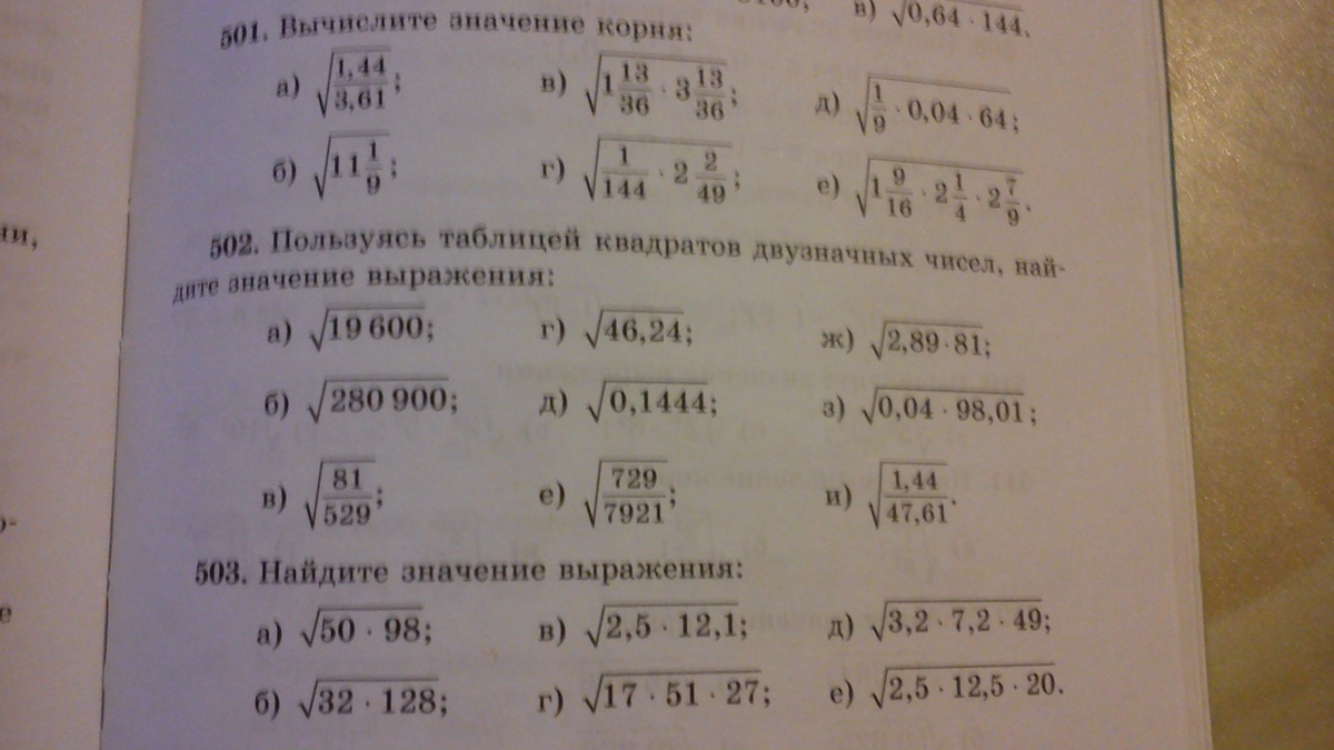 N501. а)_/1.44/3.61=_/1.2/1.9. б)_/11 1/9=_/100/9=10/3 N503. б)_/32*128=_/4096=64. а)_/50*98=_/4900=70