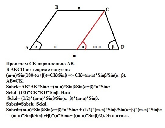 Найдите площадь трапеции, если её основания равны m и n, а прилежащие к основанию m углы равны α и β.