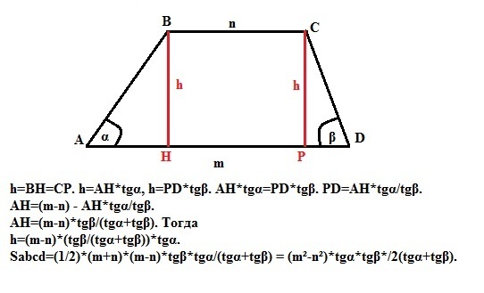 Sabcd=(1/2)*(m+n)*(m-n)*tgβ*tgα/(tgα+tgβ) = (m²-n²)*tgα*tgβ*/2(tgα+tgβ).