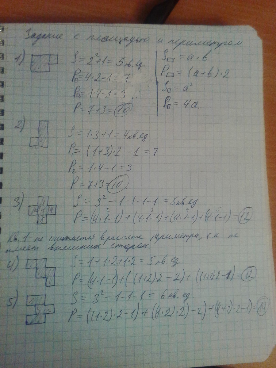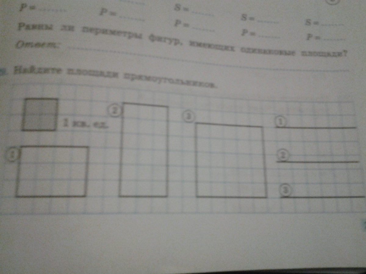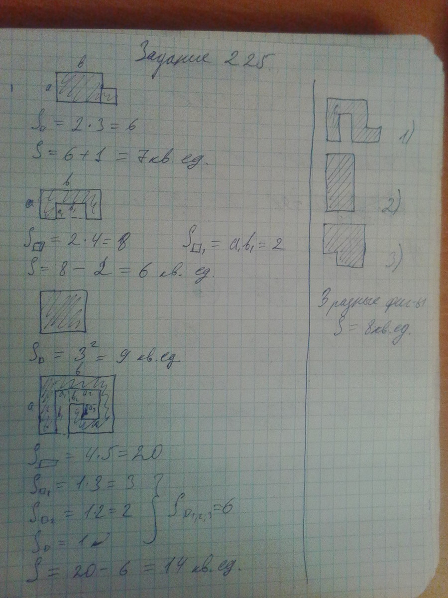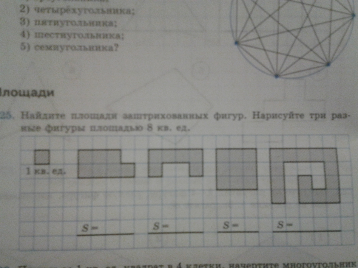 Найдите площади заштрихованных фигур. Нарисуйте три разные фигуры площадью 8 квадратных едениц.