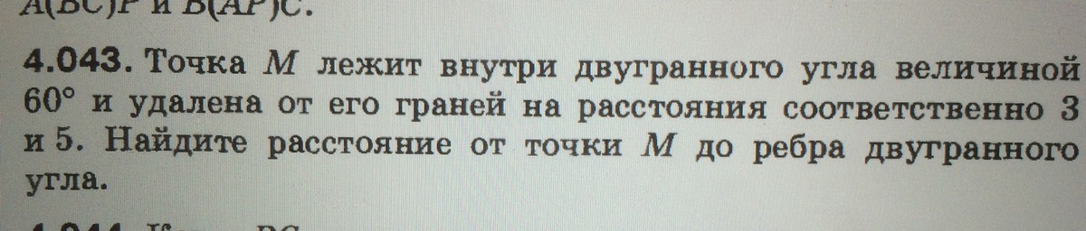 Пусть МА - расстояние от М до грани угла, равное 3, МB равно 5. Перпендикуляры из А и В, опущенные на ребро двугранного угла, приходят в точку Е. Так как МА перпендикулярно АЕ, то угол МАЕ=90 гр., также и угол МВЕ=90 гр. В сумме они дают 180 гр., значит вокруг четырехугольника МАЕВ можно описать окружность, в которой искомое расстояние от точки М до ребра угла равно МЕ. Т.к. вписанные углы МВЕ и МАЕ равны 90 гр., то МЕ - диаметр окружности. Проще всего диаметр найти из следствия теоремы синусов, которая говорит, что диаметр окружности описанной вокруг треугольника равен отношению стороны на синус противолежащего угла, то есть МЕ=(АВ)/sin(60гр.) Найдем длину АВ по теореме косинусов из треуг.МАВ. Сумма углов четырехугольника равна 360, значит угол АМВ=360-90-90-60=120 гр. АВ=кореньиз (9+25-2*3*5*cos(120гр.))= кореньиз(34+15)=7. МЕ=7/(sin(60гр.)=14/(кореньизтрех). Ответ: 14/(кореньизтрех).