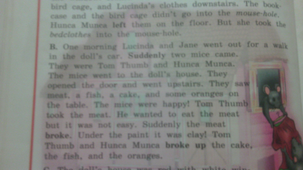 Однажды утром Люсинда и Джейн гуляли на игрушечный машине. Вдруг две мыши пришли. Они были том thumb и Хунка Мунка. Мыши ходили к кукольному дому. Они открыли дверь и поднялись наверх. Они увидели мясо, рыбу торт и пару апельсинов на столе. Мыши были счастливыми. Tom Thumb взял мясо. Он захотел съесть это мясо, но это было не так легко. Вдруг мясо сломался. Под краской была глина. Tom Thumb и Хунка мунка сломали торт, рыбу и апельсины