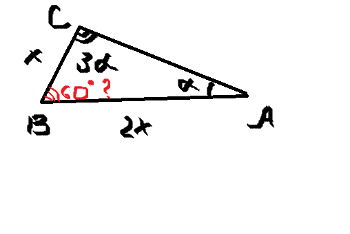 по теореме синусов х/sinα=2x/sin3α. sin3α=3sinα-4sin³α. Решаем данную пропорцию, получаем уравнение: х*sin3α=2x*sinα, sin3α=2sinα. 3sinα-4sin³α-2sinα=0 sinα-4sin³α=0 sinα(1-4sin²α)=0 sinα=0 (α=0 - не подходит) или 4sin²α=1 sin²α=1/4 sinα=+ -1/2 (берем с плюсом) α=30 градусов. Итак, угол А=30, С=3*30=90, значит В=180-30-90=60 градусов. Доказано.