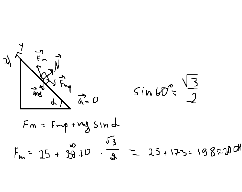 Помогите ребята! Какую силу приходится прикладывать для втаскивания груза массой 20 кг по наклонной плоскости с углом 60 градусов при основании?Сила трения 25H,движение считать равномерным .(200H)